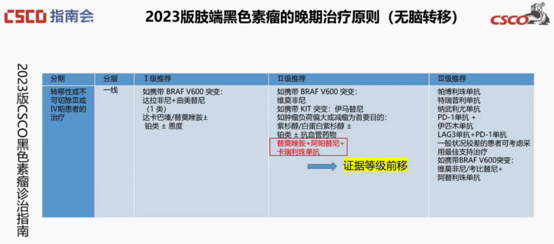 目前郭军教授团队正在同步开展基于卡瑞利珠单抗联合治疗的随机对照Ⅲ期临床研究。期待后续的研究继续取得积极结果,进一步提高以卡瑞利珠单抗为基础的三联方案在CSCO指南乃至国际指南对肢端黑色素瘤一线治疗的推荐级别,成为晚期肢端黑色素瘤一线治疗新的选择(内容来源:爱医时空)。